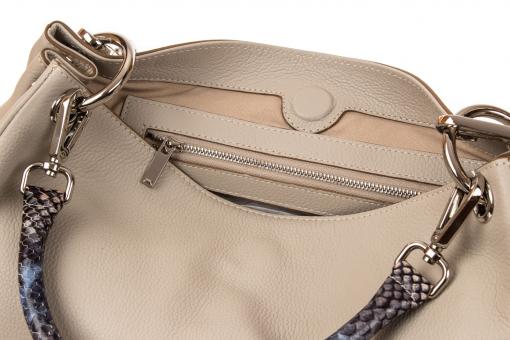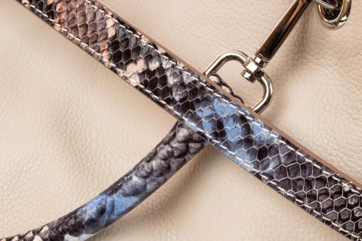 Klassische Handtasche mit farblich abgesetzten Hänkeln und Riemen.