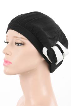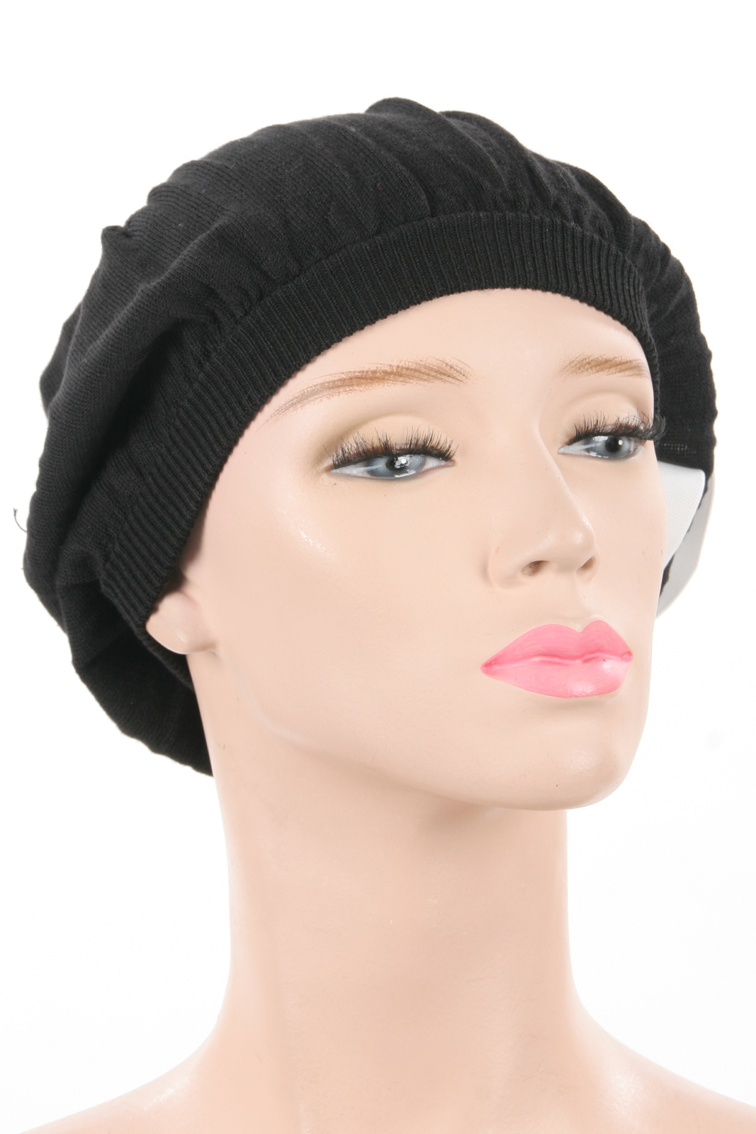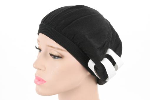 Feinstrickmütze mit weißen Streifen auf einer Seite.