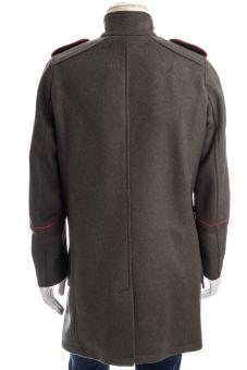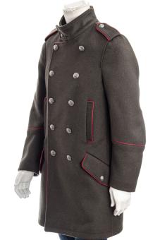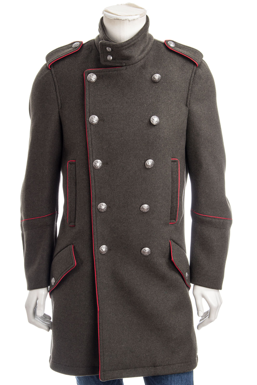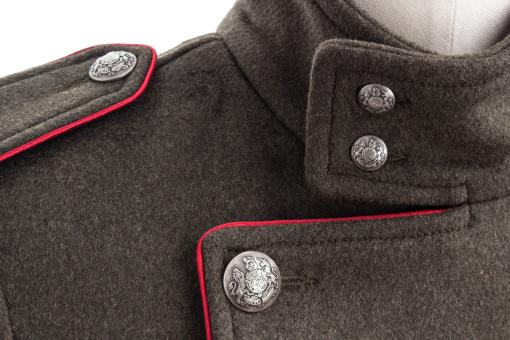 Stylischer Mantel im Military-Style mit rot abgesetzten Details und Metallknöpfen.
