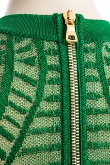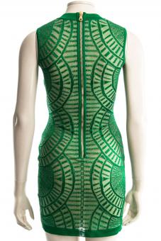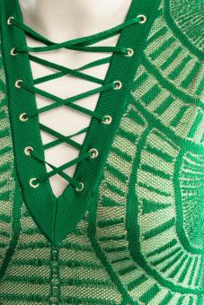 Kurzes Kleid mit einer raffinierten Schnürrung im Dekoltee, goldfarbenden Reißverschluss auf der Rückseite und hautfarbenden Unterkleid.
