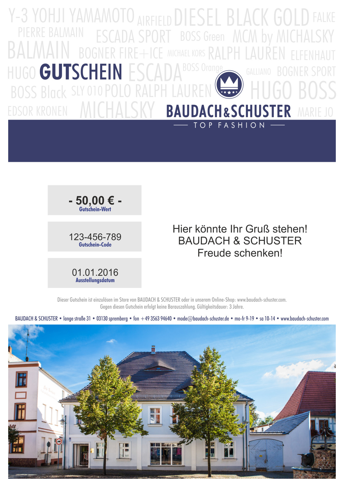 FLEXIBEL EINSETZBAR! Der Gutschein gilt sowohl ONLINE für unseren Online-Shop www.baudach-schuster.com als auch DIREKT in unserem Fashion-Store in Spremberg, Lange Straße 31. Hier genießen Sie zusätzlich unsere persönliche Beratung.