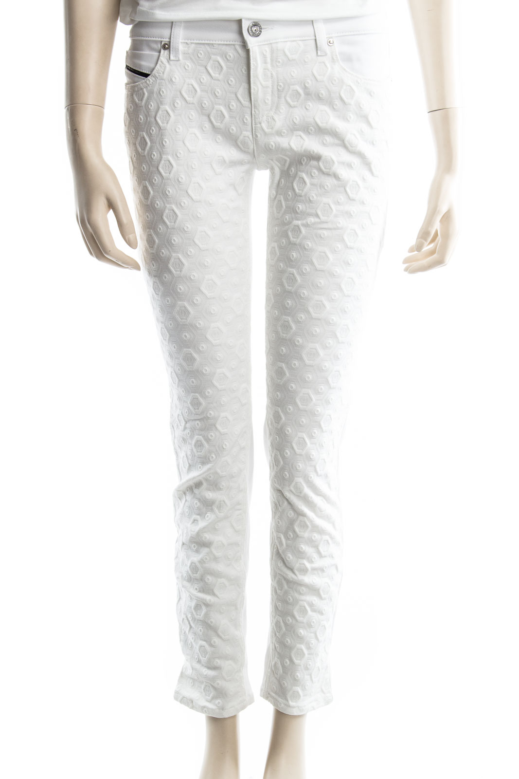 Schmall geschnitte 7/8 Jeans mit Muster auf der Vorderseite.