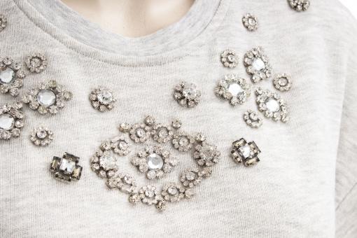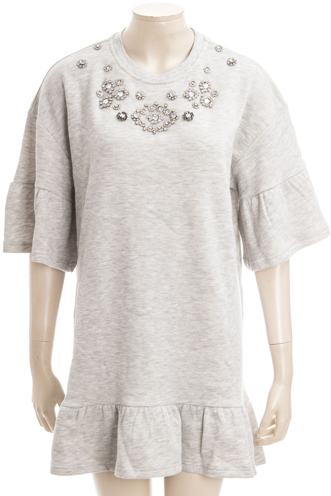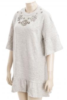 Kurzes Sweatshirtkleid mit Rüsche und Steinchenbesatz am Ausschnitt.